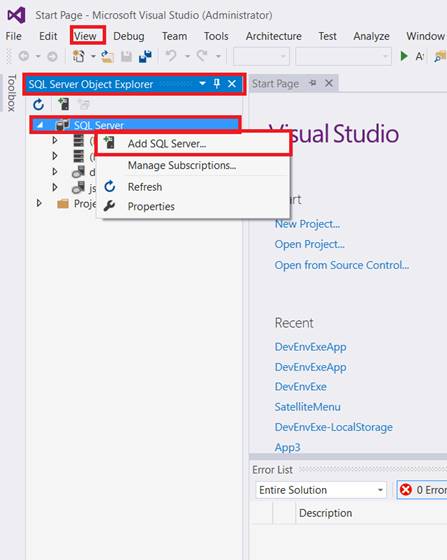 Open Visual Studio > Click on “ View “ Menu > Select “SQL Server object explorer” > Select “SQL Server” and right click > Select Add SQL Server