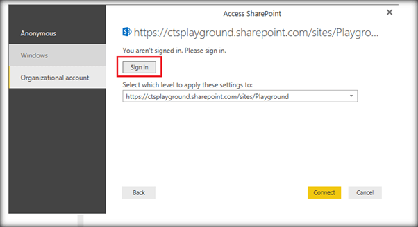 Once we are signed in, click on "Connect" to complete the connection to the SharePoint Site.