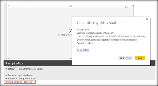 In case you come across some error as shown below, it is mainly because of right permission issues in the R Open installation folder.