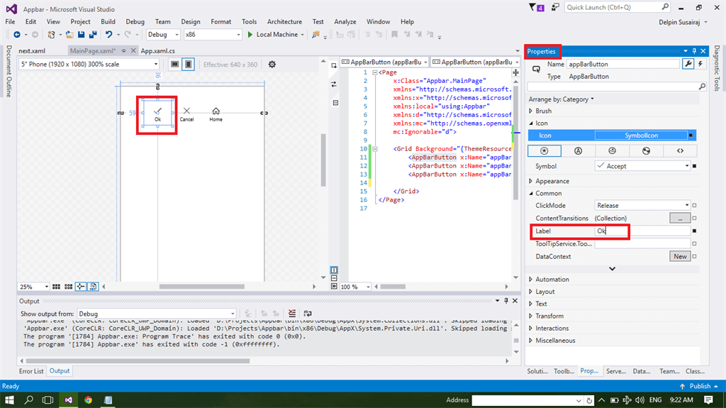 Step 4 - Edit the Lable of the appbar control button in properties Window. Chose the appbar control, go to the Properties Window. Edit the lable text.