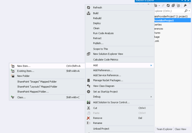 - To create a Custom Claims Provider class file, right click ClaimProviderProject project -> Add -> New Item.