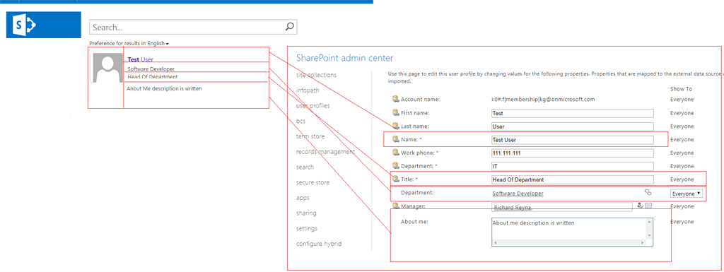 Below is a screenshot of OOTB People Search result which will sync the above four properties from SharePoint User Profiles.