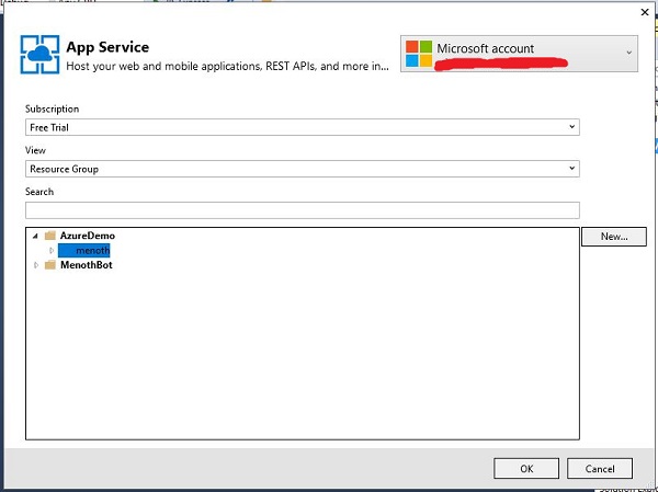 - We choose our existing resource group name ( That we created ! "AzureDemo" ) in our Azure Portal and It will display the App Name inside the "AzureDemo" folder. This will display only when we are login through the Visual Studio using Azure credentials ( Email & Password).