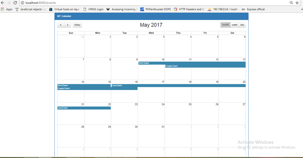 - Above we have created views, controller and route files for displaying calender and its events.Now let us view the result on localhost:8000/events.