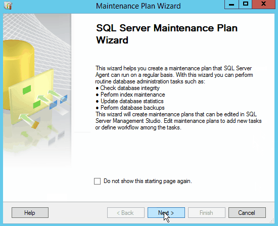 - The Maintenance Plan Wizard should be shown. Click Next.