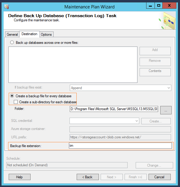 - In Destination tab, Specify The folder that should contain the automatically created database files, Specify the backup file's extension. (The default is .trn)