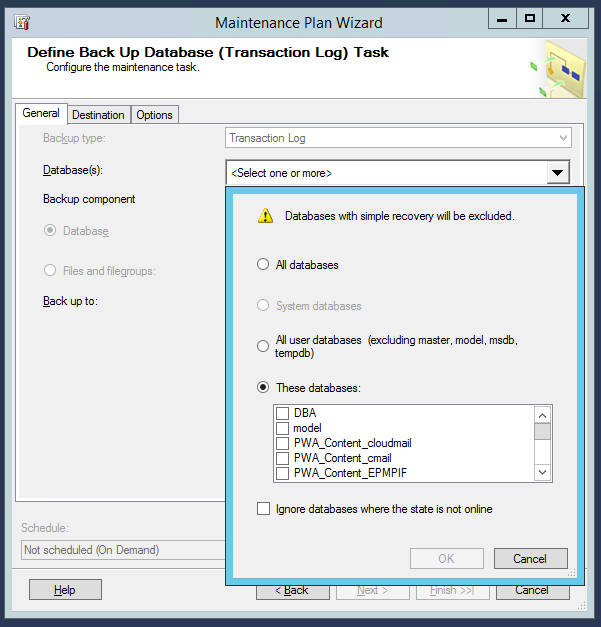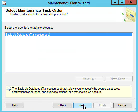 - In Maintenance Tasks > Select Backup database Transaction log > Next.