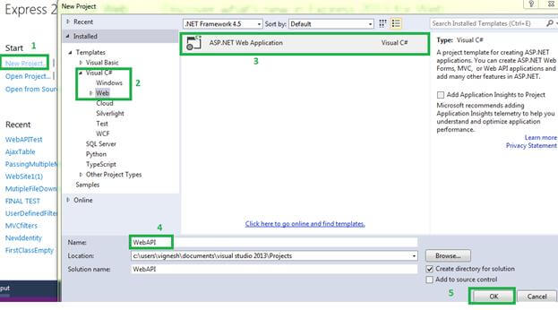 Open Visual Studio and open new project. Select Visual C# >> Web >> ASP.NET Web Application. After selecting all, give project name and click OK.