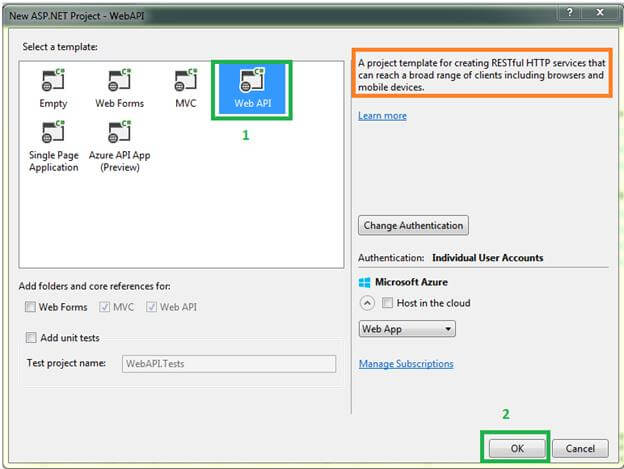 Select Web API in template window. After selecting Web API, we can see some messages in the right side in template window. Now, click OK button.
