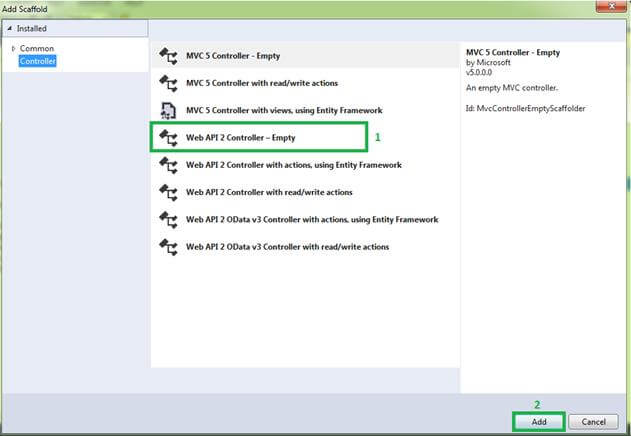 Select “Web API 2 Controller - Empty” and click "Add" button from "Add Scaffold" window.