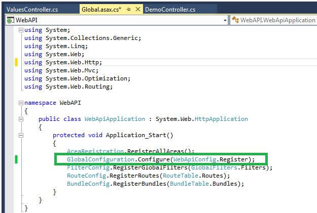 We define the Web API URL format using “GlobalConfiguration” and “Configure” static method. We are passing “Register” method from “WebApiConfig” class as argument into “Configure” method. If we go to “WebApiConfig” class, we can see Web API routes..