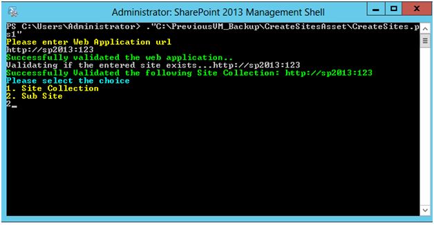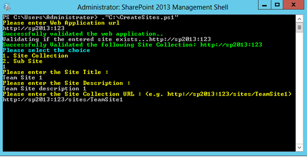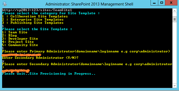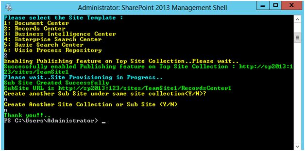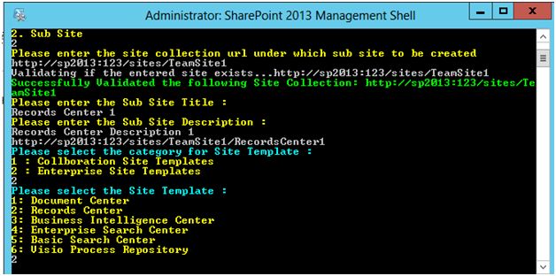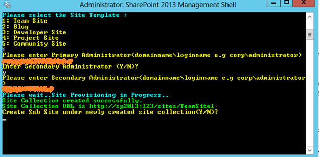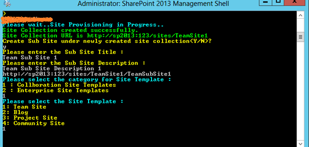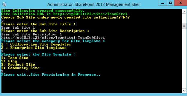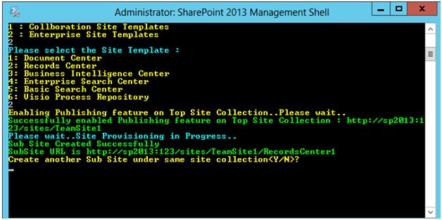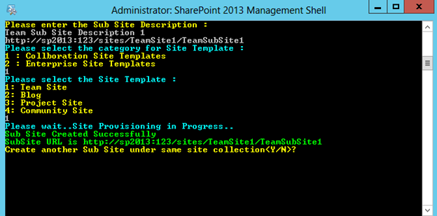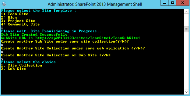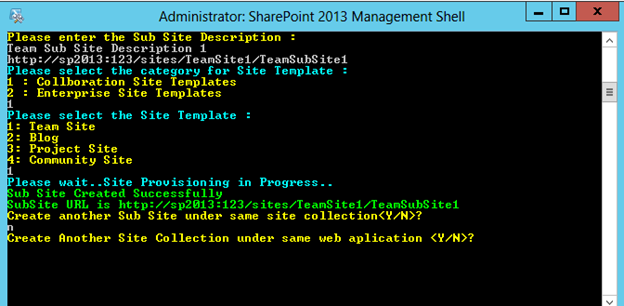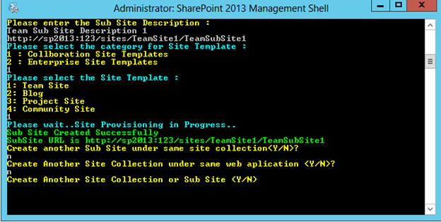 - Enter “y” if user wants another sub site to be created under same site collection. Otherwise enter “n”.