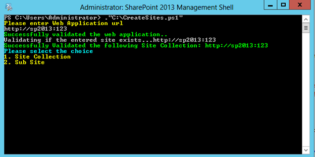 - It will validate the web application url. If root site collection is present at web application url, it will ask if user wants to create site collection or sub site.