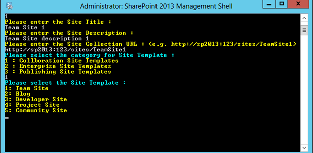 - Enter 1. It will ask the site collection details. Enter Site Title, Site description and Site Url (must be a valid URL) URL is pre-populated in ‘e.g’ part. User can use this URL.