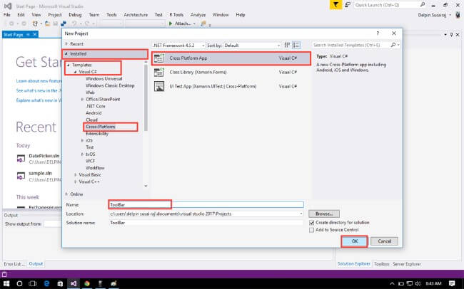 After opening the New Project, select Installed-->Templates-->Visual C#-->Cross-Platform-->choose Cross Platform App. Now, give your Xamarin form app a name (Ex:sample) and give the path of your project. Afterwards, click OK.