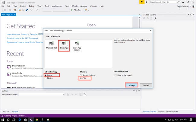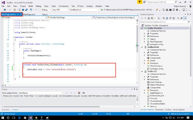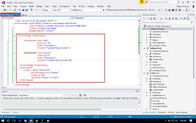 The steps given below are required to be followed in order to create ToolBarItems in Xamarin.Forms, using Visual Studio.