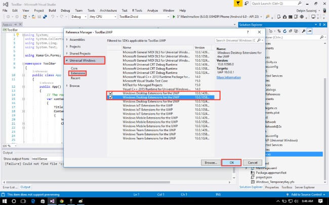 Now, go to Solution Explorer. In Solution Explorer, get all the files and sources in your project. You can add Universal Windows Platform (UWP). In Reference, go to Solution Explorer-->Your Project-->UWP-->Reference-->Right click --> Select Add reference.