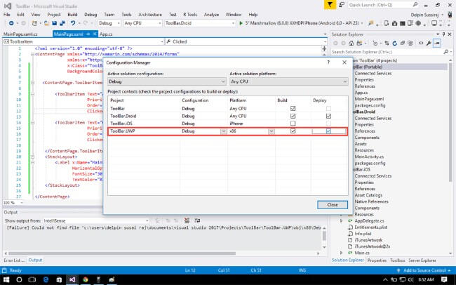 Now, you can run your app. Go to the Debug Configuration Manager. Choose platform, check the build and deploy option. Afterwards, click close.