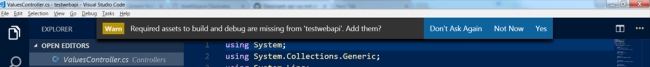 So, select "Yes" to the warning message "Required assets to build and debug are missing from 'TodoApi'. Add them?"