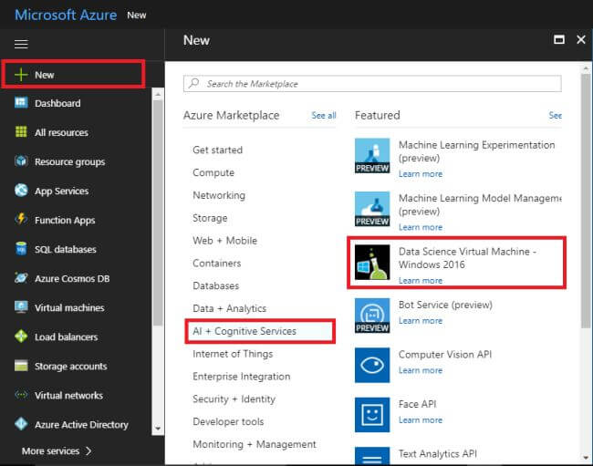 In the Azure portal , then press the "+New" and followed by "AI+Cognitive Services" and then Choose the "Data Science Virtual Machine - windows 2016".