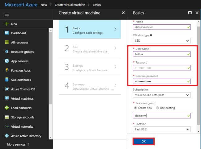 In the Data science VM creation Virtual machine blade opens , then fill all the fileds in this balde .In this you want to remember the Username and password to authorize and connect with our VM.Create the desired resource group to contain all the configurations.Then choose the particular location to eatablish our VM.Press "OK" to continue the VM creation.