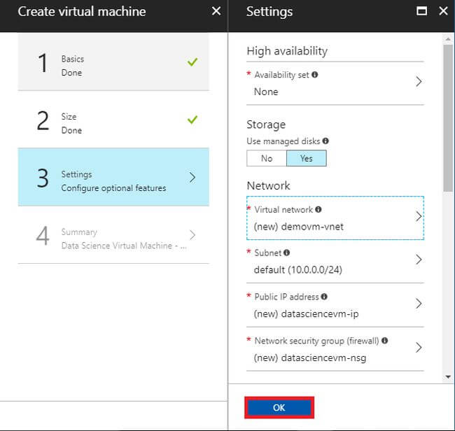 In this blade , don't change anything because for our DSVM all are predefined on all aspects like virtual networks , firewall etc..,Then press "ok".