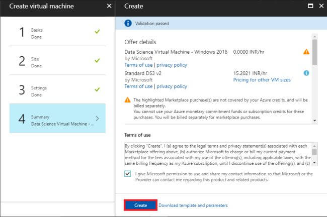 Finally it gives the detailed report of our VM and them mark the box to accept the terms and conditions for our DSVM.Then Press "Create" to create our Data Science Virtual Machine.