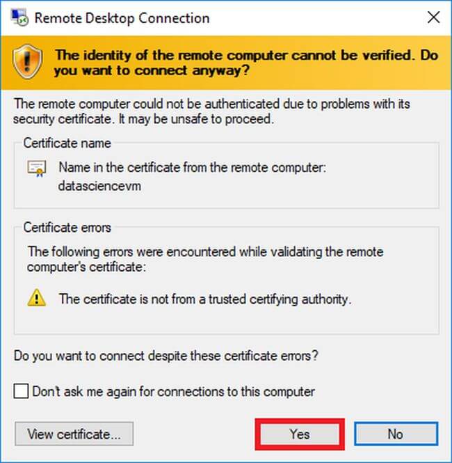 Click to open the file. Press Connect to make the connection between our DSVM to the local machine.