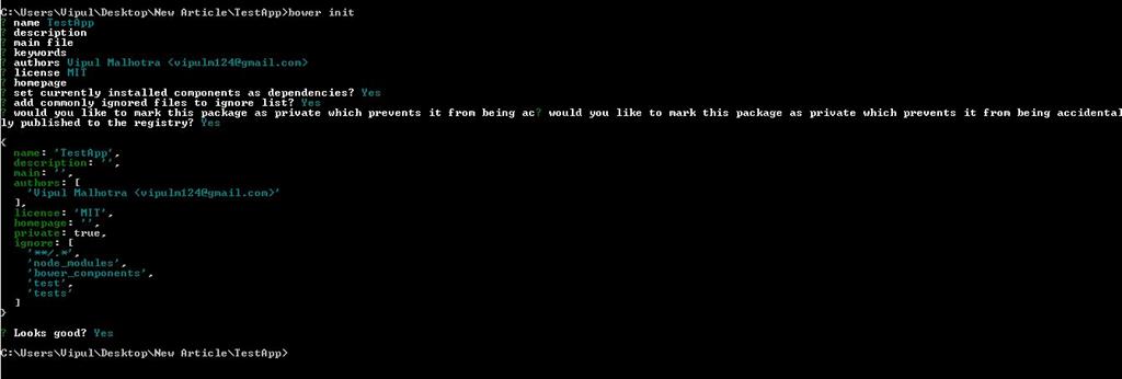 We need to have a bower file in our project. In order to get that, open Command Promt at the project directory location and use the command bower init. This will create a bower file in your project with the required details.