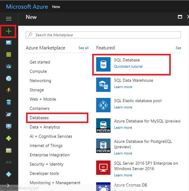 Step 2In the portal, click on "+New" >> Databases >> SQL Database.