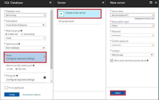 Step 4It's time to create the Server for our Database. Press "Server" to configure one. Click on "Create a new server" and enter the name of our server, server admin login, password, and location. Press "Select" to configure the server and to create it.