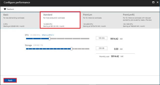 Step 5Choose the desired pricing tier in the "Choose your Pricing Tier" blade. I choose standard one for our database. Then, click "Apply".