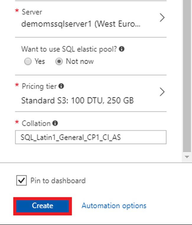 Step 6Finally, the configuration of the SQL Database is shown in the "SQL Database" blade. Just press "Create".