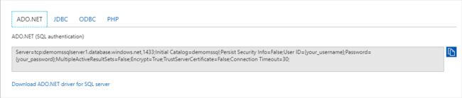 In the Overview blade, select connection strings to show your connection strings for various applications.