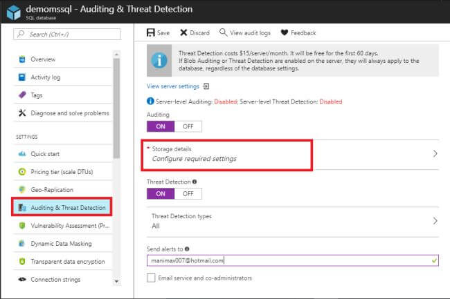 Step 8In the SQL Database, on the left side ribbon, choose the "Auditing & Threat Detection" tab to add the threat protection to your database. In that blaze, turn-on the "Auditing & Threat Detection" option.