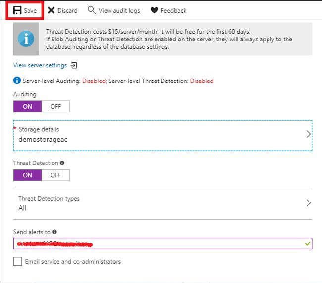 Step 11Enter the mail-id to send the alert notifications and then choose Save to save the Threat protection to the SQL Database.