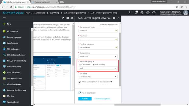 Fill the fields given below with the Server name, Server admin login, password, subscription and for resource group, select the existing resource group in which the database has been uploaded, location of the same and click Create.