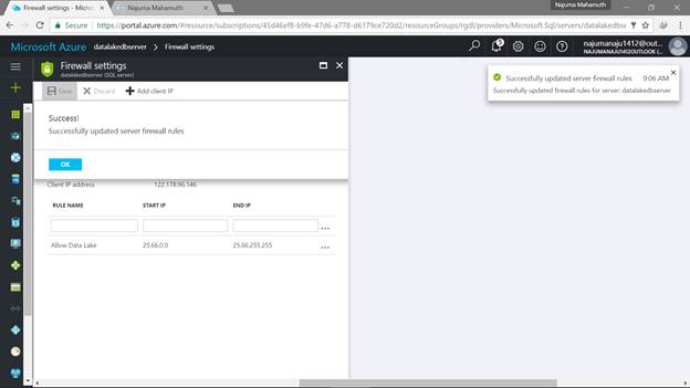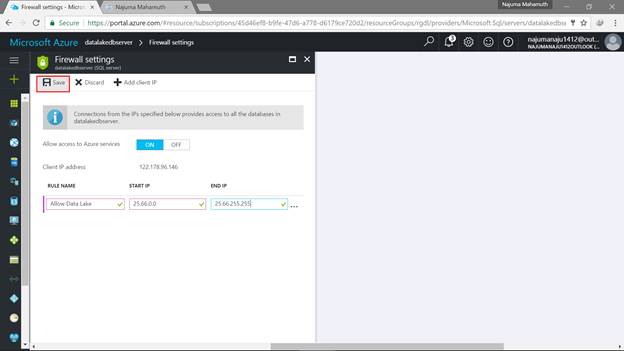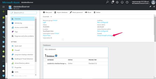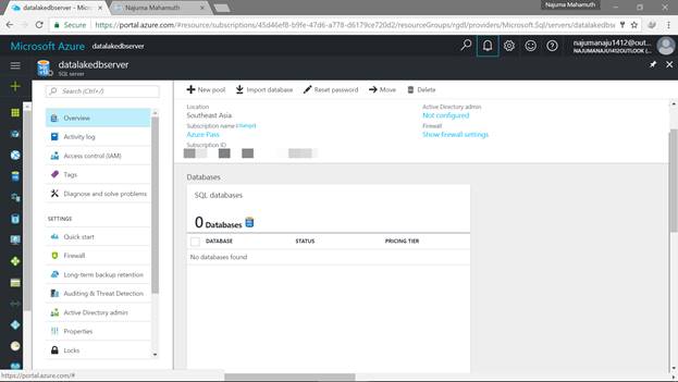 In the mean time, until it gets imported, let's configure the Firewall on our database instance. Move back to the home page of Microsoft Azure portal, click on the database Server named “datalakedbserver”.