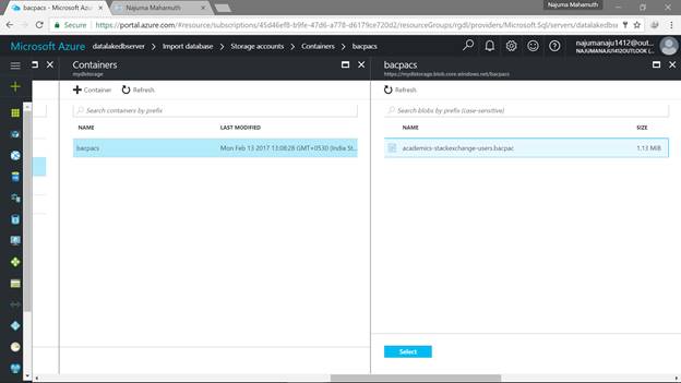 Click on the respective container on the storage account and select the database named “academics-stackexchange-users.bacpac”.