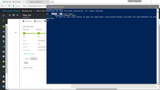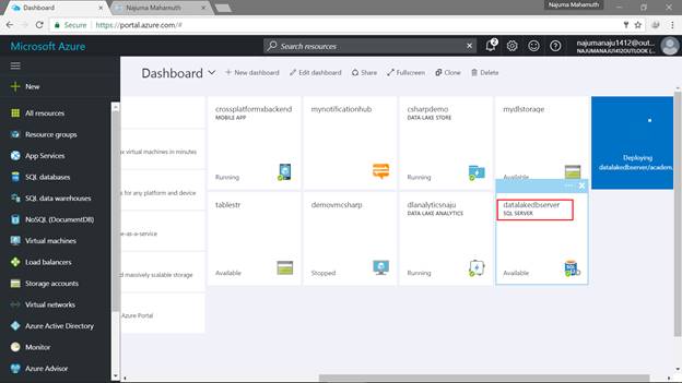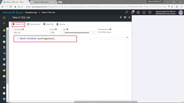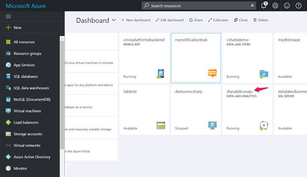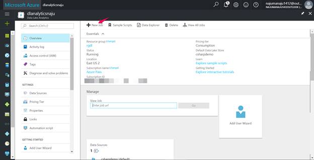 Again, move back to the Microsoft Azure portal home page and click on Data Lake Analytics “dlanalyticsnaju”.
