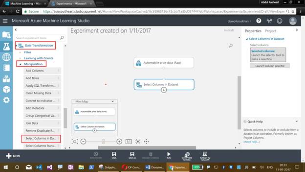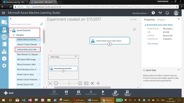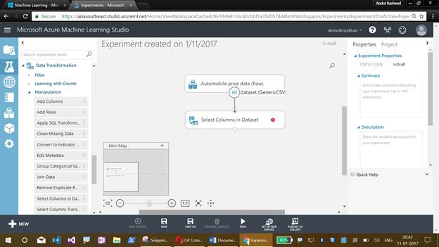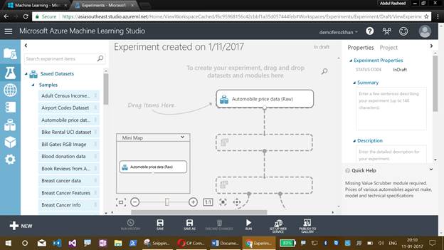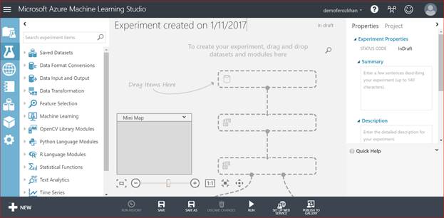 Now comes the graphical display of our Azure Machine Learning Studio experiment, which will help us to drag the items. This also illustrates the flow of an experiment.