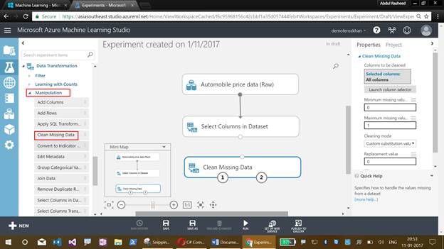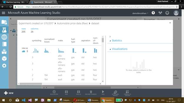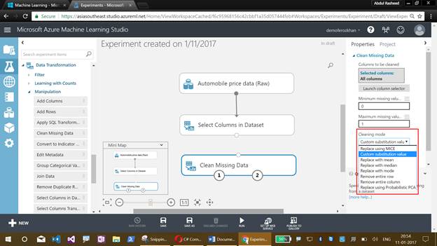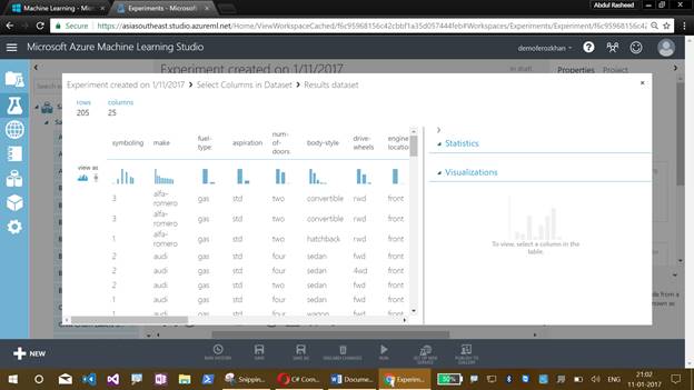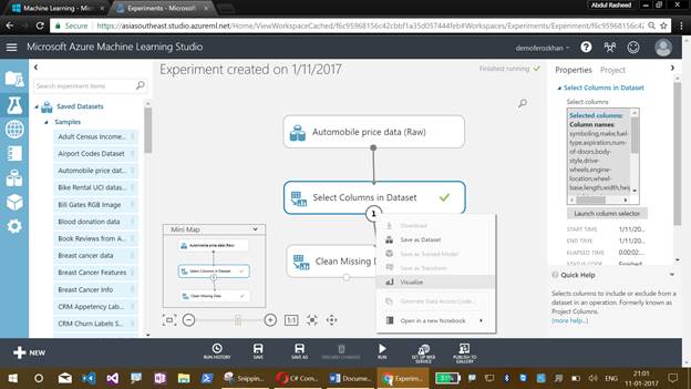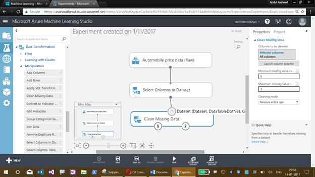I have discussed about the Machine Learning Studio, their menus, creating an experiment, working with sample datasets, refining with the missing values and getting clean data for training the model.