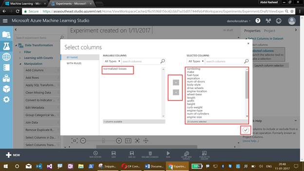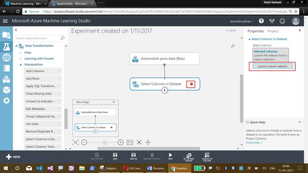 The list of columns which has to be selected is not mentioned in the Datasets and due to this reason, we get the exclamatory symbol here. To overcome this, click on the Launch Column Selector, except normalized losses move, all the other columns will load the columns for the next step. Now, the exclamatory symbol will not be available on the Workspace.