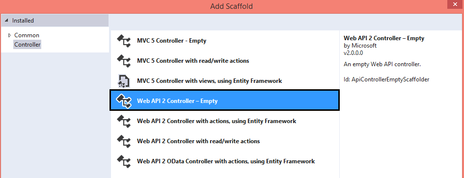 Create a WEB API project and add a WEBAPI 2 Empty Controller, as follows:
