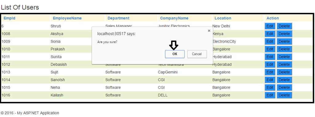 Now, write the following ActionMethod in Home controller to delete the selected user: