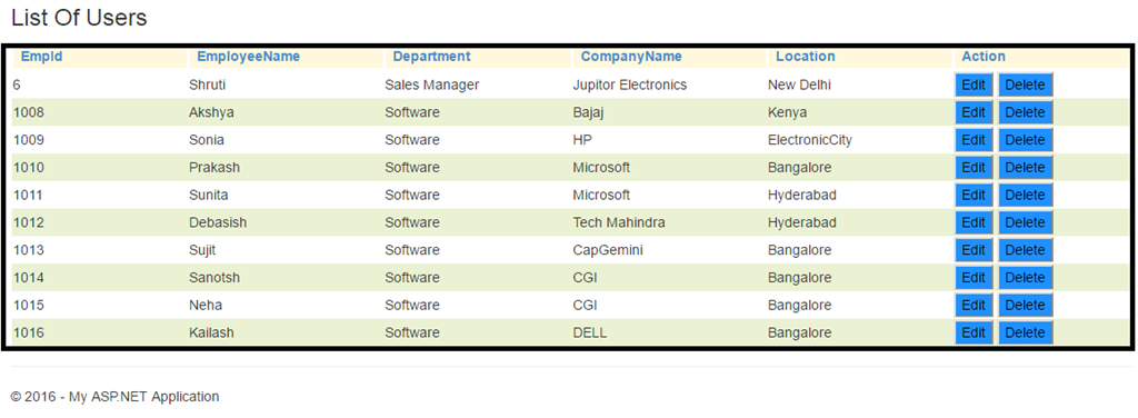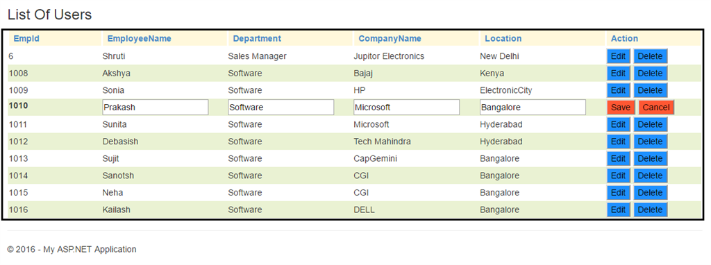 I hope this article will help to learn these initial steps toward Creating and Consuming WEB API with complete CRUD operation of Webgrid. If I missed anything, please mention in the comments, so that I can implement that the next time.