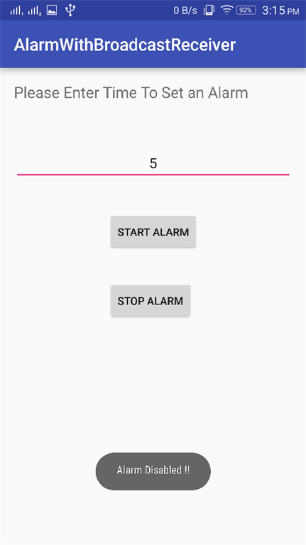 Summary In this article we has learned how to create and schedule the alarms and notify user via BroadcastReceiver. Selecting first the Alarm type and appropriate methods to start Alarm using AlarmManager class.