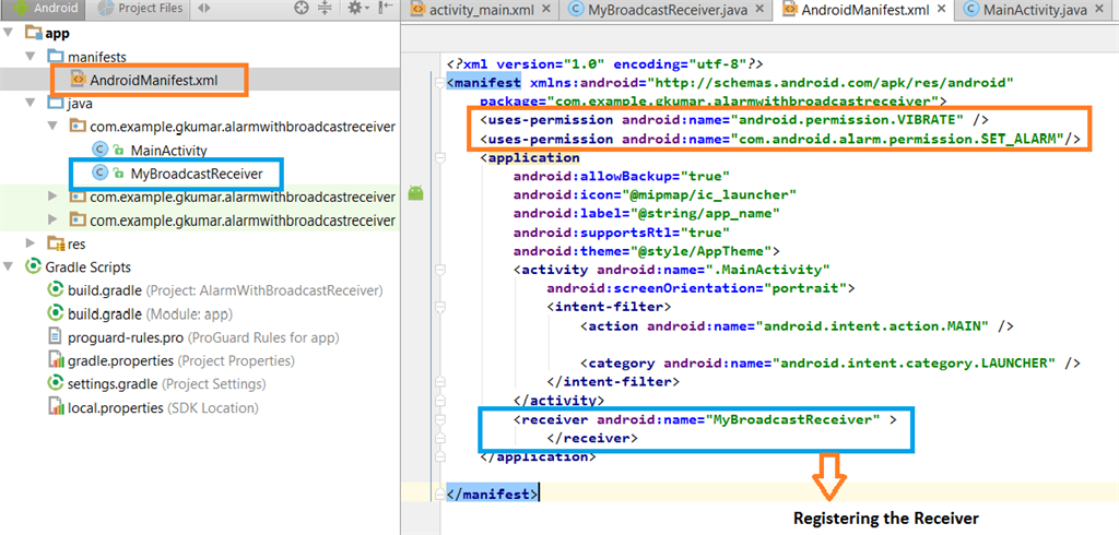 Coding the Manifest file and adding permission to vibrate and registering the receiver of name
