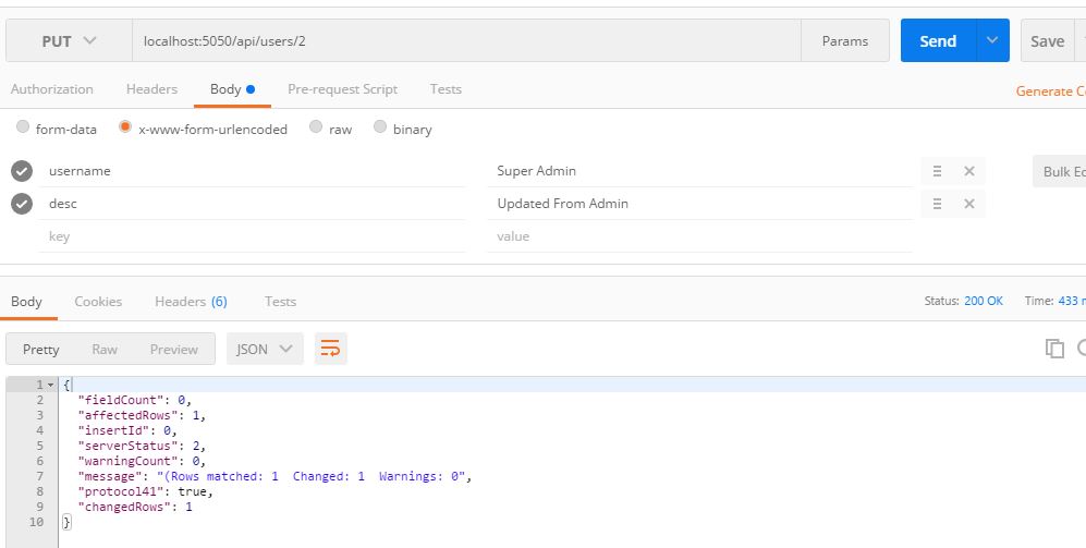 - con.query('UPDATE users SET UserName=? , Description=? where UserID=?', [req.body.username, req.body.desc, req.params.id], function (err, rows) {