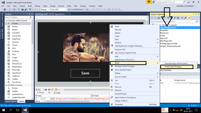 Let us assume that the below given screenshot is the completely developed application. Now, the first step is to right click on the name of the project and select the Store menu. Now, a small menu pops up. Select the "Create App Packages..." option. The following is explained in the screenshot below.